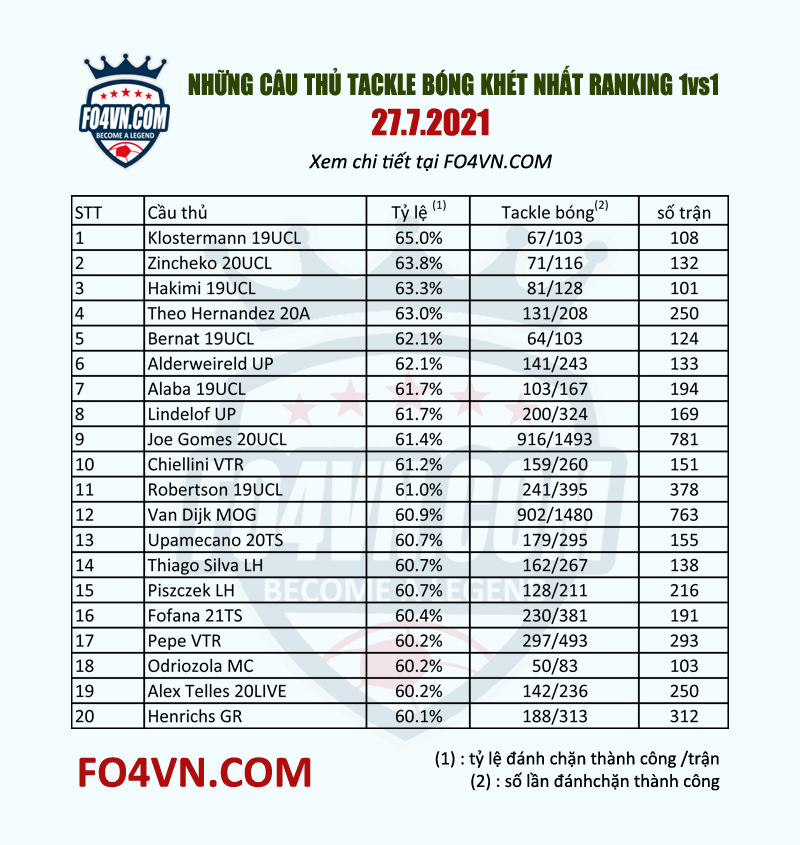 Sau những cái tên đánh chặn, chúng ta sẽ đến với những cầu thủ có khả năng tackle bóng mạnh mẽ nhất. Khái niệm tackle bóng bao gồm cả lấy bóng và xoạc bóng trong game. Tuy nhiên đa phần chúng ta sẽ hiểu đó là những pha xoạc bật gốc đối phương hoặc chọc chân ngăn cản đối phương đi bóng.