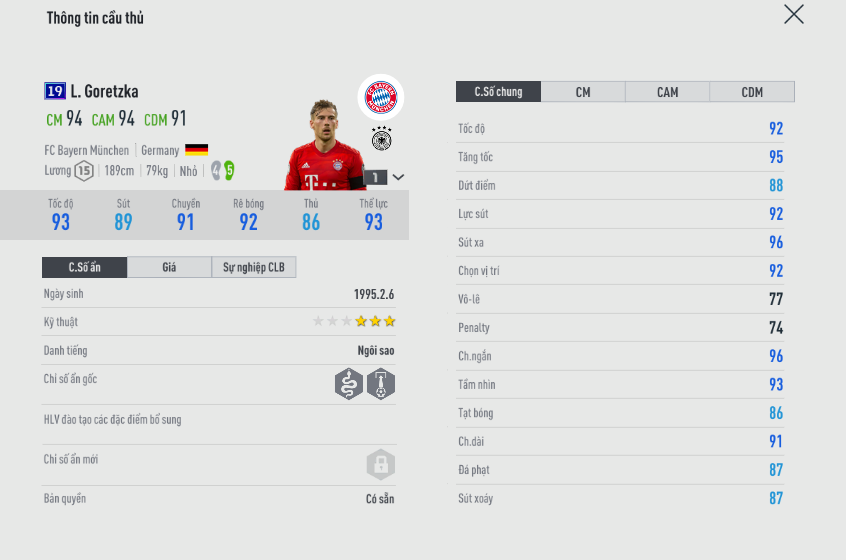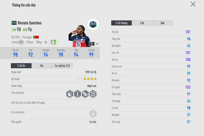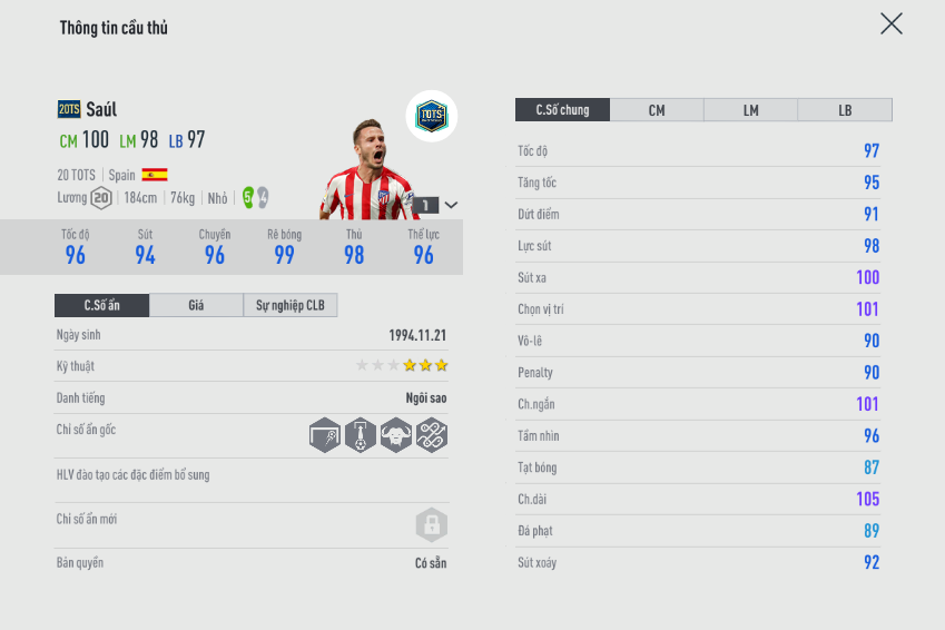 - Chiều cao 1m88 nặng 78kg, một thể hình lý tưởng trong tựa game FIFA Online.