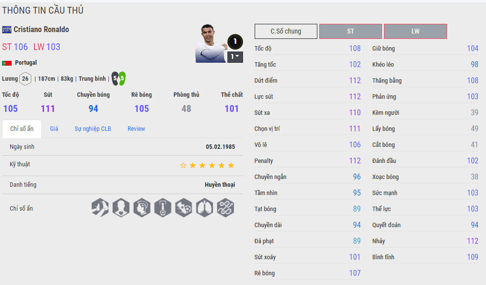 Sự thống trị của Cr7 21TY là một hiện tượng trong tựa game này, bởi đã qua 2 năm thì mùa giải 23TY của Ronaldo vẫn có chất lượng cực cao, mức lương bằng luôn với Haaland 23TY dù chỉ số kém nhau tới 5 điểm. Vậy có phải chăng Nexon đã tính toán sai mức lương cho Cr7 ? không phải đâu, nếu để chọn giữa Cr7 21TY và Haaland 23TY thì tôi cá là nhiều người sẽ chọn Cr7 đấy.