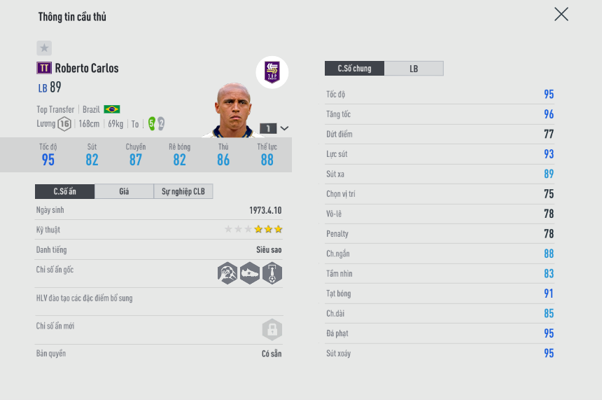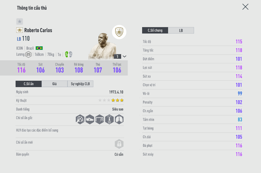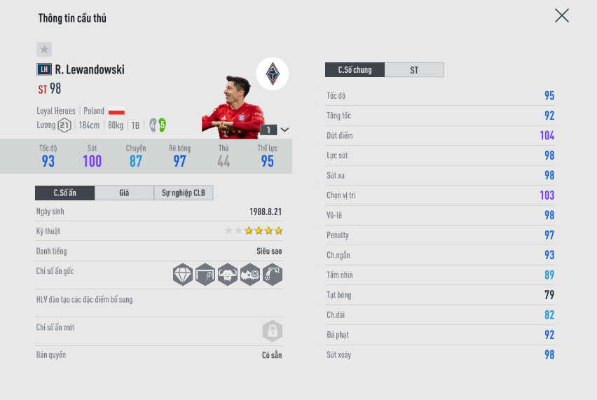 Siêu tiền đạo đương đại ở ngoài đời, mặc dù trong game anh thuộc vào dạng kén người dùng, nhưng không thể phủ nhận anh là một chân sút phạt cự phách trong game. Cho dù các chỉ số đá phạt chỉ ở mức tầm tầm. Bạn đã bao giờ thử cho tiền đạo người Ba Lan thử sức trước tình huống đá phạt tầm xa chưa