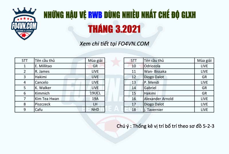 RWB đa phần được tận dụng từ đội hình chính đá 1vs1/ Tuy nhiên có thể thấy Millitao GR vẫn là lợi hại hơn cả. Trong khi đó Reese James càng ngày càng được ưa chuộng hơn