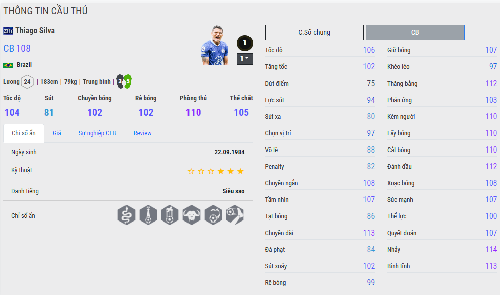 Thiago Silva với mùa giải 21UCL và đặc biệt là 23TY cho chúng ta một mẫu SW cực tốt trong game, thậm chí anh còn có cả siêu cản phá dù chỉ số ẩn này chỉ dành cho các huyền thoại. Chất lượng của mùa giải này cũng thể hiện đúng phẩm chất thủ lĩnh và chắc chắn của Silva ngoài đời.