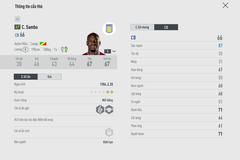 Nếu bạn từng chơi Fo3 thời kỳ mà Ibrahimovic và Drogba 07 làm loạn trong game, thì bạn sẽ nhớ cái tên Samba này. Bởi đây là số ít các hậu vệ có được sức mạnh và thể chất có thể chơi sòng phẳng với hai huyền thoại trên. Tuy không quá nổi tiếng nhưng khoản đấm nhau thì Samba chưa ngán ai bao giờ. Tiếc rằng ở Fo4 thì anh đã vào giới hạn.