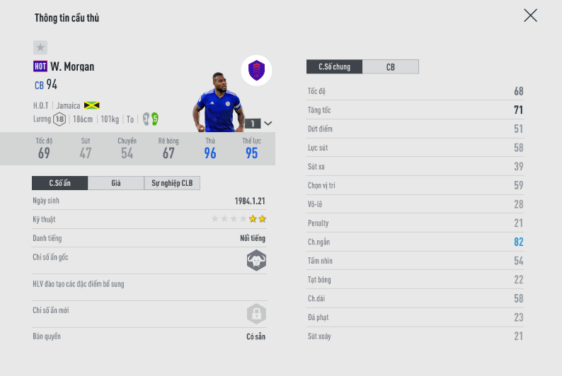 Cựu đội trưởng của Leicester City, người vừa mới giải nghệ mùa bóng vừa rồi là một cái tên mà bất cứ tiền đạo nào ở ngoại hạng Anh phải dè chừng, bởi anh có thừa sức mạnh để cân mọi thể loại tiền đạo nếu muốn dùng sức để qua người. Morgan có AI khá ổn, bất chấp cho việc tốc độ là điểm yếu của anh, thì Morgan vẫn được một bộ phần người chơi ưa chuộng