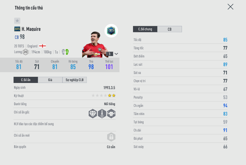 Là hậu vệ số 1 của MU hiện tại, Maguire được ca ngợi là một siêu trung vệ trước khi chuyển tới MU thi đấu. Bỏ qua nhưng chệch choạc ban đầu, hiện nay Maguire đã cho thấy anh xứng đáng với số tiền mà MU bỏ ra góp phần giúp MU cán đích ở vị trí thứ 2. Trong game mùa giải 20TS của Maguire được đánh giá cực cao bởi anh có thừa cho mình những yếu tố hàng đầu cho một trung vệ ở meta game hiện tại