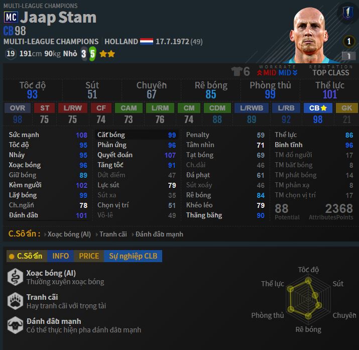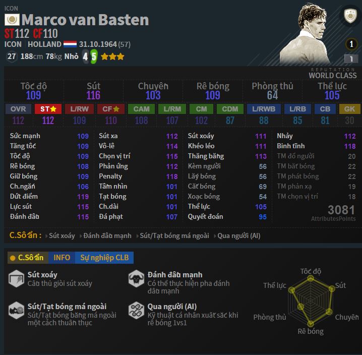 Huyền thoại Hà Lan. Tiền đạo số một của FO3 nửa sau của game. Mặc dù thuộc vào hàng khó dùng, nhưng đã dùng được thì xin chào bạn đã có một cây săn bàn khủng khiếp nhất. Thế nhưng sang Fo4 thì Van Basten lại khá tù do các mùa giải của Basten ra đến HOT thì dừng. Và đến giờ trong game chỉ có 3 thẻ là NHD, TC và HOT. Mặc dù tại sever Trung Quốc thì Van Basten vẫn có thẻ ICON. Tuy nhiên sau scandal vạ miệng về phát xít Đức. Van Basten đã bị EA bỏ khỏi danh sách ICON, và tất nhiên FIFA Online 4 cũng chịu chung số phận. Có lẽ sẽ không bao giờ chúng ta được thấy Basten ICON chạy trong game nữa. Với các fan hâm mộ thì mùa HOT là sự an ủi cho việc sở hữu thần tượng chạy trên sân.