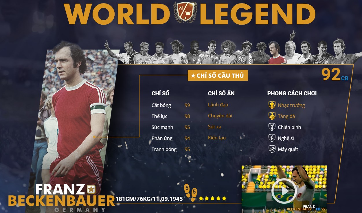 Hoàng đế của bóng đá Đức. Huyền thoại của huyền thoại, đối thủ của Johan Cruyff. Thế nhưng sau khi giúp cho nước Đức dành quyền đăng cai WC 2006. Thì 2016 ông bị dính líu đến pháp luật khi bị điều tra về việc mua phiếu bầu cho Đức tại cuộc chạy đua đăng cai WC 2006. EA rất nhạy cảm với những vẫn đề này và thế là Franz Beckenbauer đã không còn có mặt trong các dự án của EA. Mặc dù ông là một cầu thủ toàn diện nhất trong game