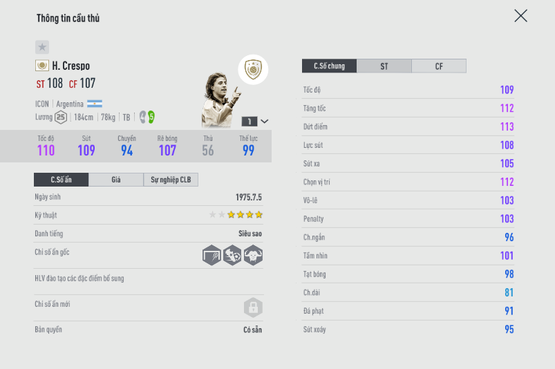 Một thương hiệu và giờ Crespo cực khỏe, việc tiền đạo này càn lướt, xông pha giữa các hậu vệ hiện tại đã được nâng cấp hơn, đồng thời cũng giúp cho Crespo có nhiều cơ hội hơn. Điểm yếu duy nhất vẫn là khả năng phối hợp của Crepso rất tệ. Nên hãy dùng anh chàng này theo đúng tiêu chí, nhận bóng và sút. Tỷ lệ 0.7 bàn/trận