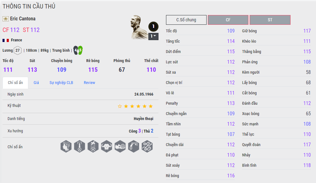 Đã khá lâu rồi chũng ta không được các HLV sử dụng Cantona hành các hàng thủ trong rank xếp hạng nữa. Đơn giản là từ sau thời kỳ Nexon chú trọng đến hai chân 5/5 thì Cantona bỗng dưng ra rìa. Dù cũng có chân 4/5 nhưng chân trái của Cantona chưa bao giờ nhận được sự tin cậy của các HLV cả.