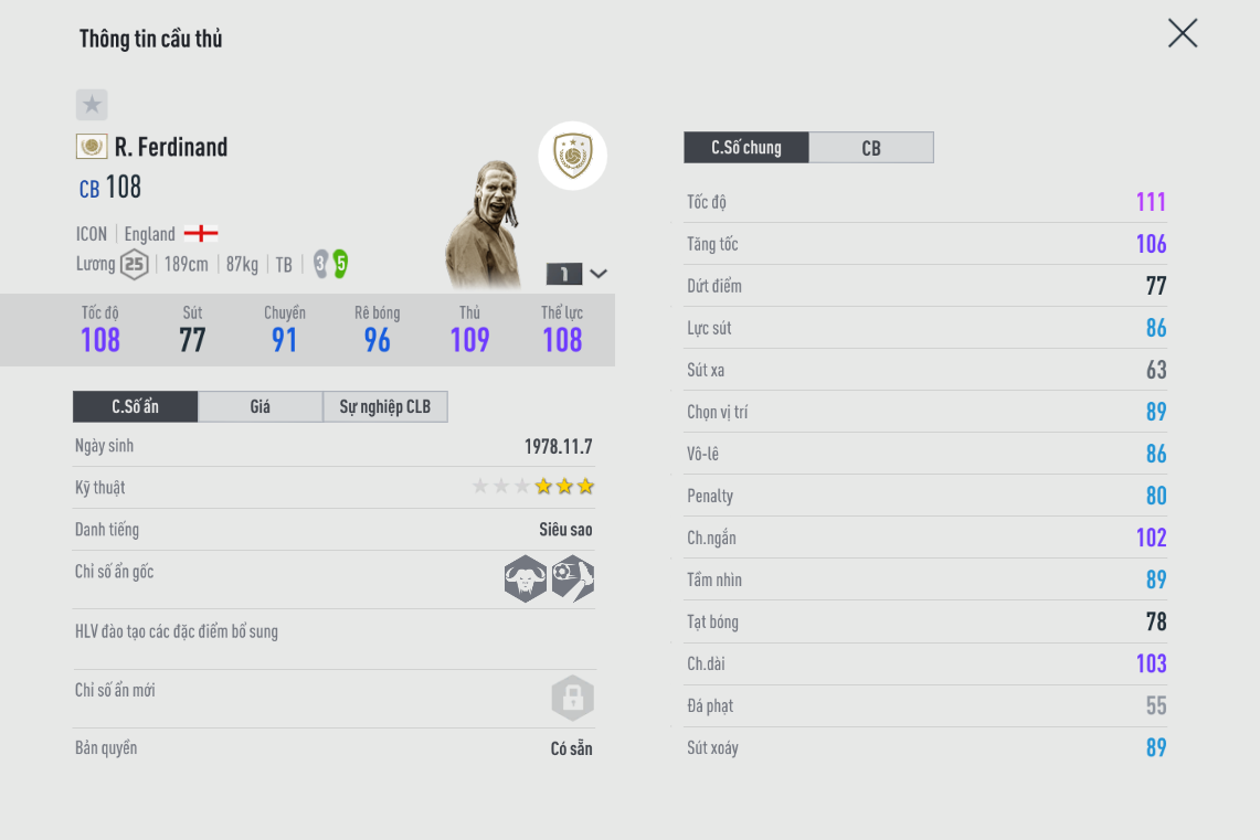 Huyền thoại của MU và cũng là hậu vệ ICON được đánh giá cao nhất cả về thể hình lẫn tốc độ, không ngoa khi nói rằng đấy chính là CB tốt nhất mà Nexon đem lại cho người hâm mộ, nhưng cũng làm game nhạt nhòa khi mà các huyền thoại khác như Canavaro hay Hiero không còn đất dụng võ.