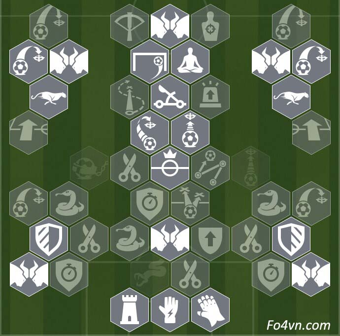 Đầu tiên chúng ta sẽ đến với bản đồ phân bổ kỹ năng theo từng vị trí trên sân. ( Trong bài viết tên các kỹ năng được viết theo mô tả của người viết bài nên có thể không khớp với tên trong game)