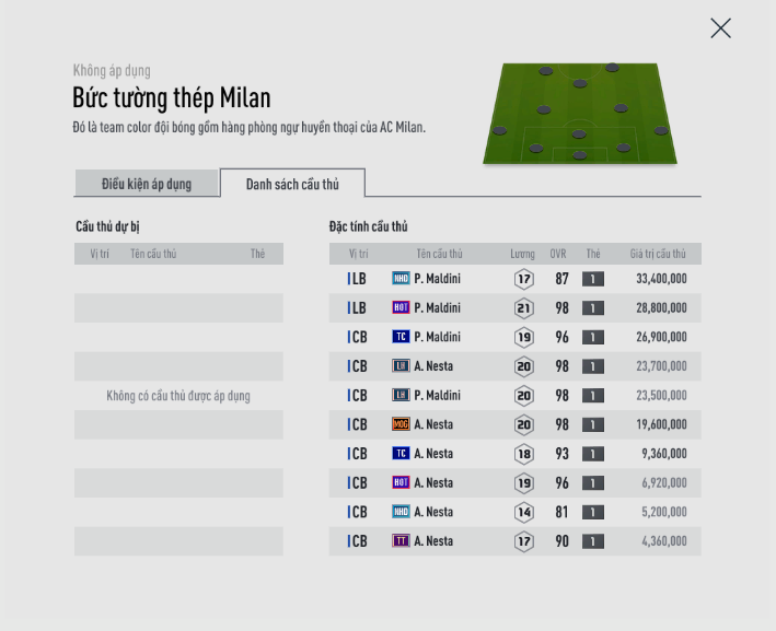 Đây là mini color yêu cầu cần có 3 cầu thủ. Tuy nhiên trong danh sách lại chỉ có 2 cái tên là Maldini và Nesta. Không rõ cái tên còn thiếu là Cafu hay Stam. Do cả hai cầu thủ này Garena không mua bản quyền