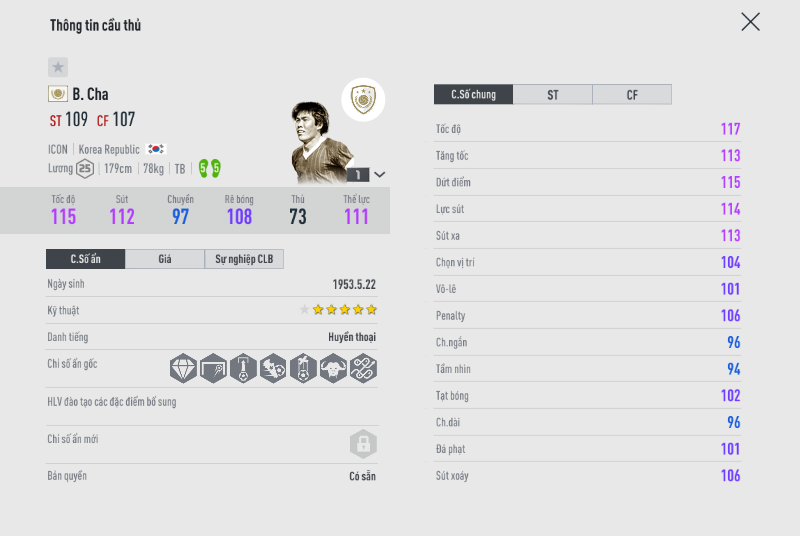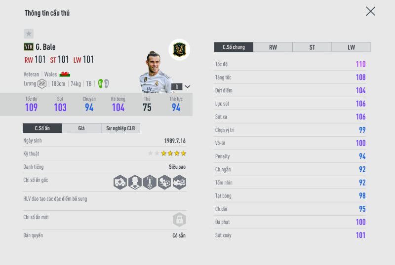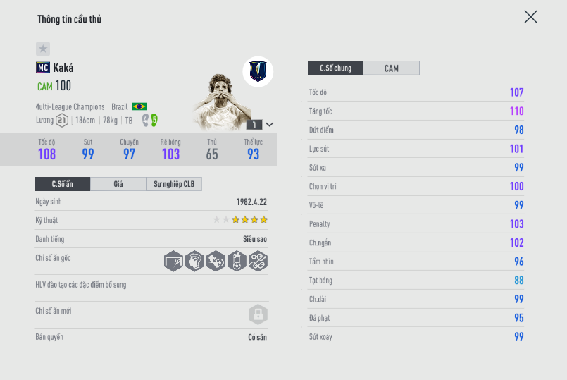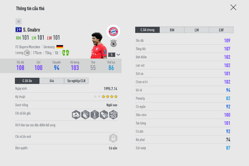 Top tiền đạo cánh thời điểm hiện tại, AI cực khôn cùng bộ chỉ số hoàn hảo cho hành lang cánh. Gnabry thậm chí còn đá tốt cả 2 cánh nhờ chỉ số 2 chân 5-5. Gnaby rê bóng không bị thô, lối chơi có phần uyển chuyển, tốc độ tốt, khả năng rê dắt bóng rất tốt ở cự ly tốc độ cao.