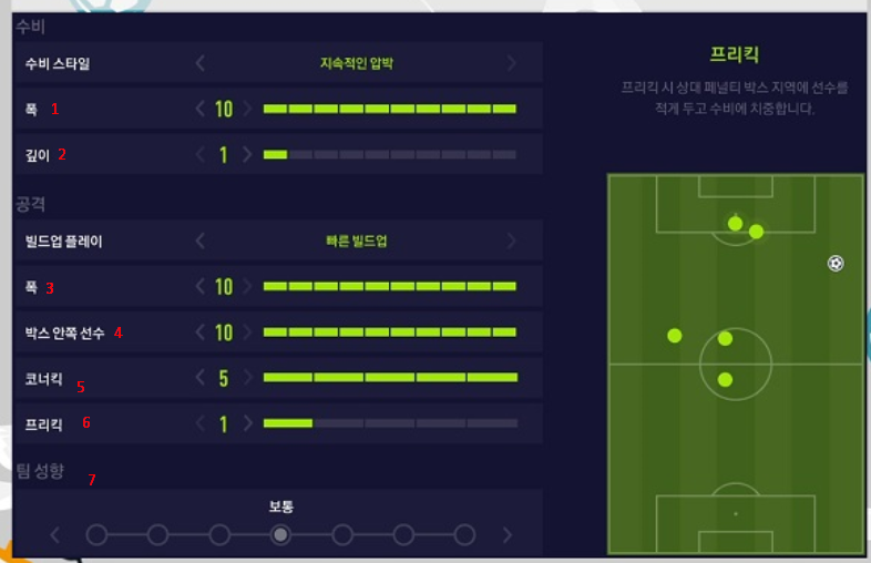 3- chiều rộng - tương tự như phòng thủ, theo tôi đa phần các HLV sẽ chọn mức 10, vì nó đồng nghĩa với việc bạn có thể đá cánh và trung lộ được, giả dụ bạn đá 42211 thì mức 10 mới phát huy được sở trường của hai LM RM