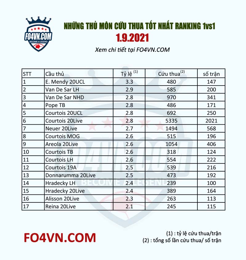 Một trong những tiêu chí giúp bạn cảm giác thủ môn của bạn "ảo" đó chính là việc trong trận đấu thủ môn đó cứu thua bao nhiêu lần giúp bạn. Dưới đây là danh sách những thủ môn có tỷ lệ cứu thua tốt nhất hiện nay.