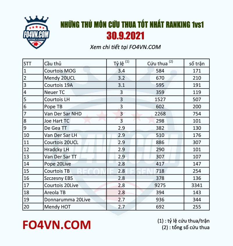 Thống kê những thủ môn có tỷ lệ cứu thua xuất nhắc nhất tháng 9 sẽ khép lại một tháng với nhiều biến động về TTCN và mùa giải của FIFA Online 4
