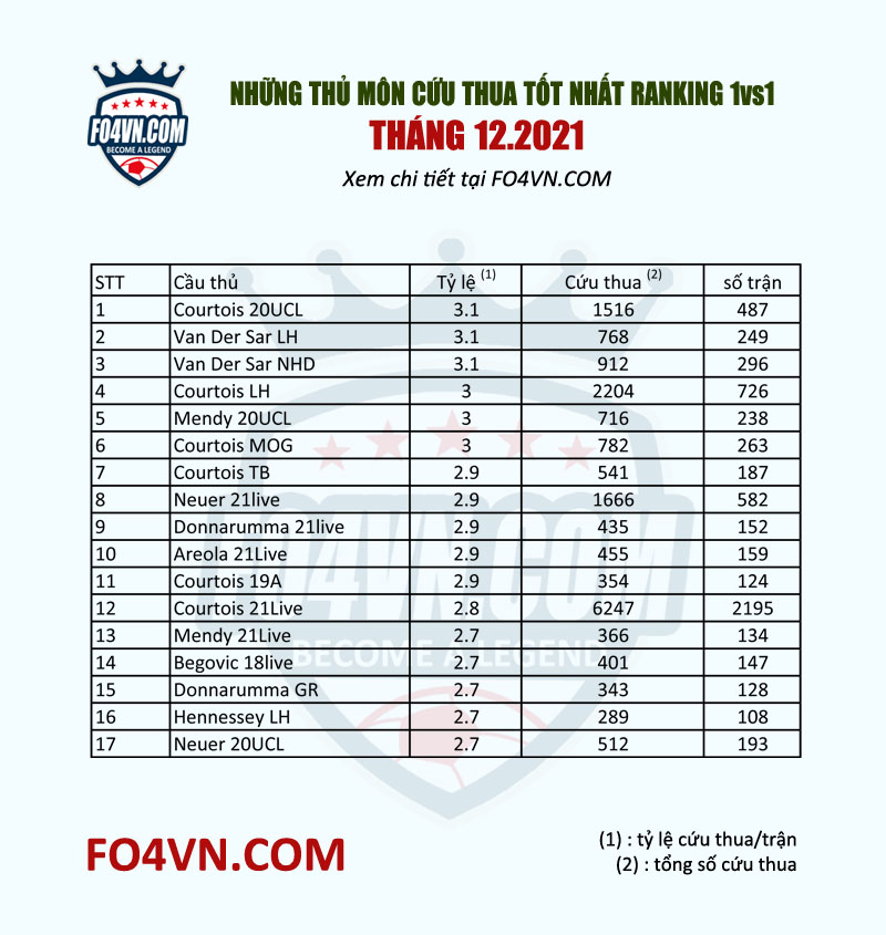 Nỗi ám ảnh của mọi người chơi Fo4 không chỉ là Mendy hay Van Der Sar, còn rất nhiều thủ môn khác cũng có khả năng bắt bóng ảo không kém. Tuy nhiên càng lên cao thì số lượng thủ môn được các game thủ sử dụng ngày càng bó hẹp lại với số lượng khá ít ỏi. Dưới đây là những cái tên các bạn có thể tham khảo qua