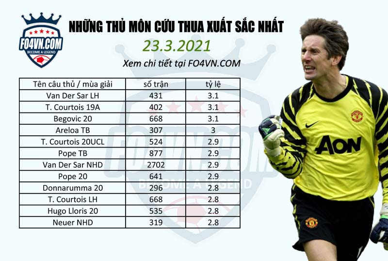 Dưới đây là 10 thủ môn có tỷ lệ cứu thua trong trận đấu cao nhất, tính đến ngày 23.3.2021 Hi vọng nó sẽ giúp bạn lựa chọn tốt hơn vị trí gác đền cho mình.
