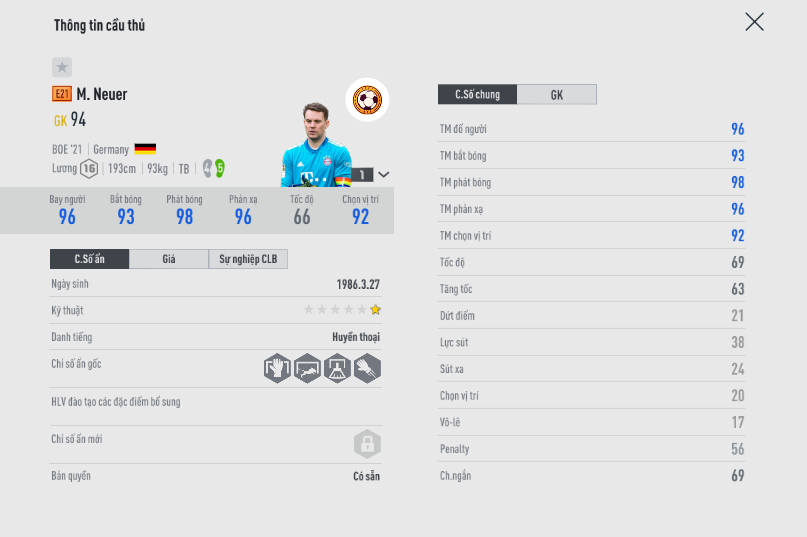 Khả năng duy trì tính ổn định vè mặt phong độ của Neuer là rất tốt, đặc biệt phù hợp cho những người chơi xây dựng team color Bayern hay ĐT Đức.
