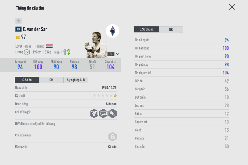 Huyền thoại của Man Utd là một trong những thủ môn có khả năng cản phá ZD ổn nhất game. Sải tay dài, chiều cao lý tưởng khiến Van Der Sar trở thành lựa chọn đáng tin cậy cho những người chơi xây dựng team color Man Utd hoặc ĐT Hà Lan.