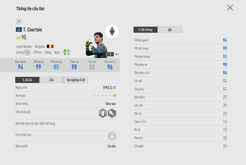 Không phải kể quá nhiều về sự xuất sắc của Courtois trong FIFA Online 4 bởi thể hình lý tưởng, khả năng bắt bóng cũng như phản xạ xuất sắc. Courtois còn có cho mình tính ổn định cực cao qua từng mùa giải cũng như qua từng phiên bản Update. Anh trở thành lựa chọn ưu tiên số 1 cho những team Color như Chelsea, Real Madrid, ĐT Bỉ,...