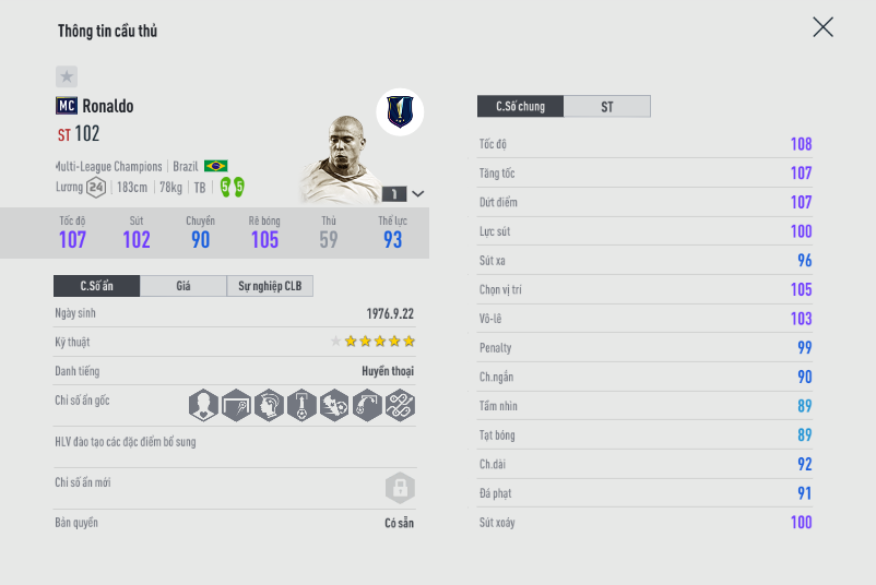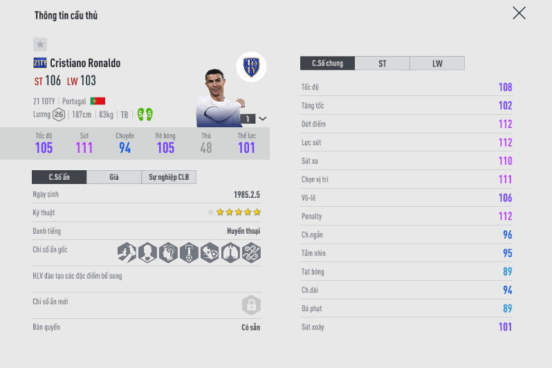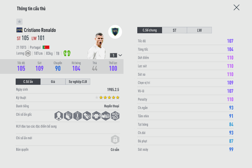 Thêm một mùa giải của Ronaldo nhưng là mùa mới gần đây 21TS. Bạn có thể tham khảo so sánh giữa hai mùa giải tại link này của chúng tôi