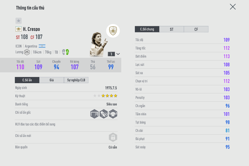 Khá nhiều bạn sẽ thắc mắc giống tôi là tại sao trong top 100 rất ít Eusebio ICON. Có thể do giá của ông quá cao hoặc có thể là một nguyên nhân nào khác chăng ? Crespo là mẫu ST toàn diện từ đầu game cho đến hiện tại. Cho dù phong độ có đôi chút thiếu ổn định và chuyền kém, nhưng lối đá của tiền đạo này là tương đối dễ làm chủ