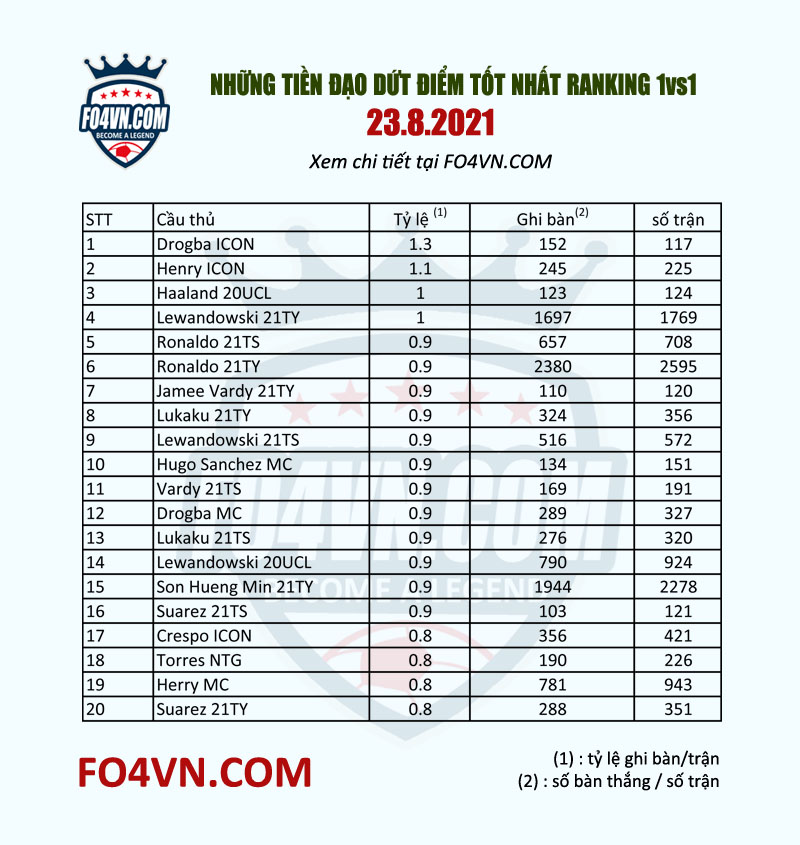 Thống kê được lấy ở thời điểm ghi bàn và trong ranking 5000, nên có thể thay đổi sau đó.