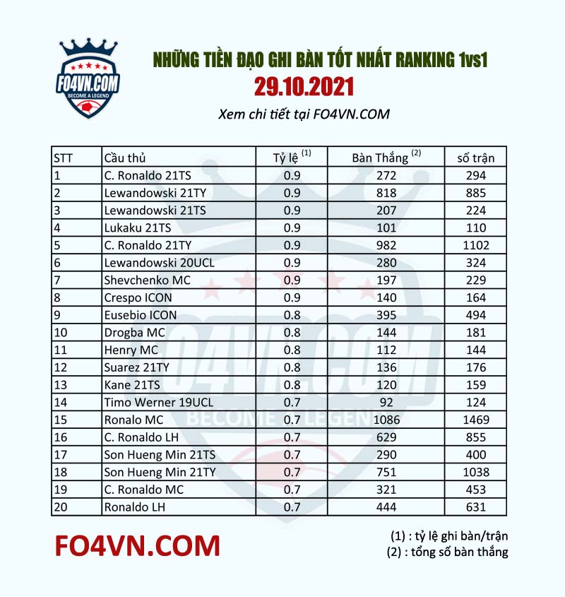 Kết thúc tháng 10, chúng ta cùng thống kê lại những cầu thủ theo từng hạng mục mà đa phần các HLV quan tâm. Đầu tiên là các tiền đạo có tỷ lệ ghi bàn tốt nhất trong tháng 10
