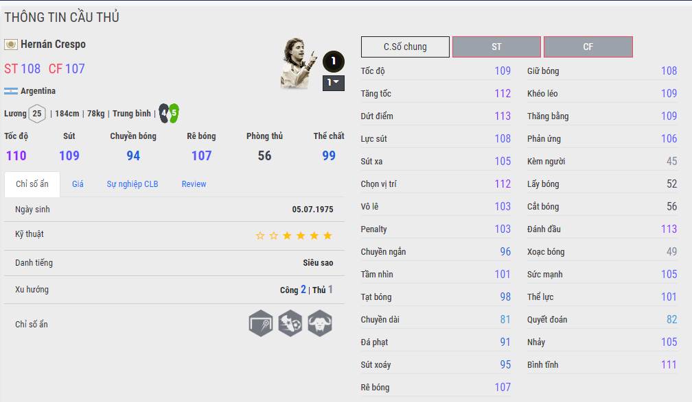 Tiền đạo toàn diện người Argentina, có khả năng chơi đầu cực tốt. Ở các phiên bản trước thì Crespo vẫn luôn được đánh giá ở top đầu về khoản không chiến. Tuy nhiên giờ đây với độ chính xác tăng vọt thì huyền thoại này như cá gặp nước. Gõ đầu rất chuẩn và hay