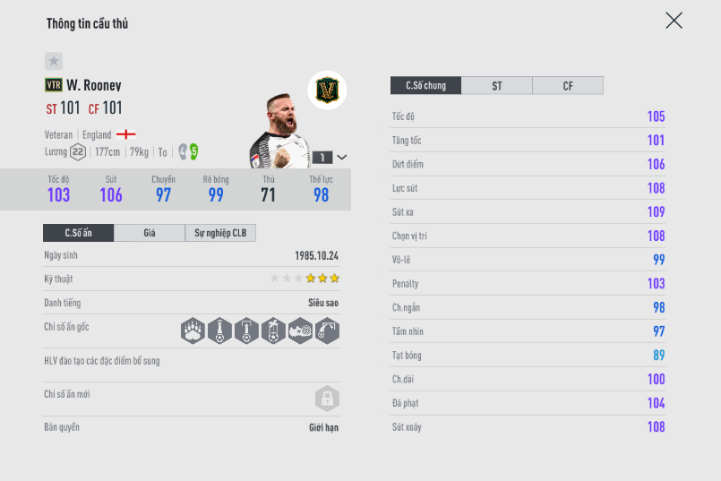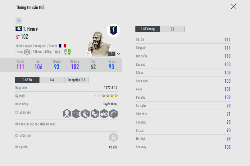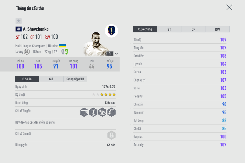 Giá của Sheva trên TTCN chỉ vào khoảng 200m BP cho mức thẻ +1. Nếu chăm chỉ bạn hoàn toàn có thể có cho mình được mức thẻ + 3 hoặc + 5 nếu muốn, đây là mẫu tiền đạo kén người dùng, những đã dùng được thì khỏi bàn, lối chạy chỗ thông minh và dứt điểm hay của Sheva là điểm mạnh nhất của anh.