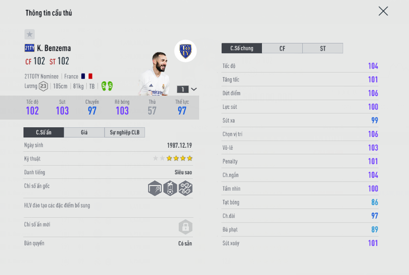 Một cái tên đầy chất lượng nhưng giá chỉ loanh quanh ở mức ~2 tỷ BP. Nếu bạn còn phân vân trong việc tìm một CF cho đội hình của mình thì Benzema là cái tên mà bạn không cần phải đắn đo nhiều, bởi độ tín của cầu thủ này không phải chỉ có một phiên bản game, mà đã trải qua suốt một năm 2021 rồi