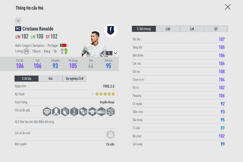 Không thể sở hữu Ronaldo 21TS hay nhất của Cr7, bạn vẫn có thể dùng mùa MC với mức giá tầm 500m BP. Hiệu suất vẫn cực cao, bởi những gì cần thiết nhất cho một tiền đạo cắm đều hội tụ đủ ở thẻ MC rồi, và từng đó là quá đủ để bạn có thể đi bón hành cho các đổi thủ của mình