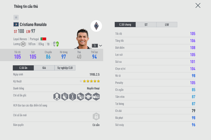 Khỏi phải bàn cãi về việc Ronaldo đá hay như thế nào trong game. Ngoài tốc độ, độ nhạy bén và khả năng ghi bàn ở mọi góc độ, Ronaldo có trong team như một liều thuốc tinh thần cho sự an tâm về hàng công của các HLV. Có nhiều mùa giải của Ronaldo trong game. Tuy nhiên nếu để chọn ra cái tên đá ST tốt nhất hiện nay, thì đó là 21TY. Thế nhưng lựa chọn mùa LH đem lại hiệu quả cao không kém cùng với giảm được 3 đơn vị lương so với 21TY. Chưa kể bạn hoàn toàn có thể nâng +5 dễ dàng hơn.