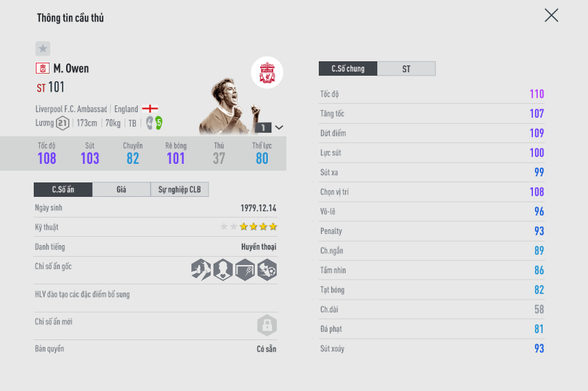 Tiền đạo huyền thoại Owen tuy có quãng thời gian ngắn ngủi khoác áo MU. Tuy nhiên nếu bạn bỏ qua sự khó chịu giữa 2 đội bóng kình địch nhau là MU, Liverpool. Bạn hoàn toàn có thể sử dụng Owen như một mũi khoan chủ lực của team. Nhanh, dứt điểm sắc bén, hiếm khi Owen bỏ lỡ thời cơ lắm đấy.
