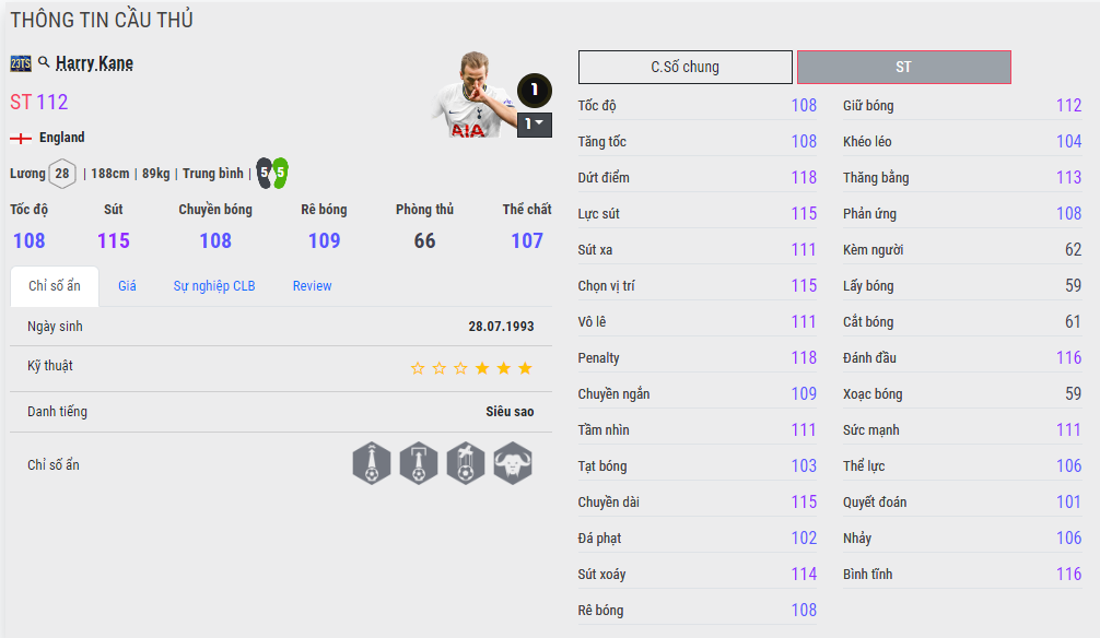 Đây chắc chắn là tiền đạo làm tường hàng đầu trong FIFA Online, chỉ cần nhìn vào thể hình của Kane thôi có lẽ không phải đắn đo suy nghĩ làm gì nhiều. Kane thuộc số ít những tiền đạo "đá bằng cái tên" trong FO4. Có rất nhiều mùa trong Fo4 của Kane đá rất tốt, đặc biệt có thể kể ra như HG, 23TS, WC22 ...đây đều là những mùa giải dễ chơi dễ làm quen với đa phần các HLV trong game. Kane có thể ghi bàn bằng nhiều phương án, thậm chí là cả tạt cánh đánh đầu.