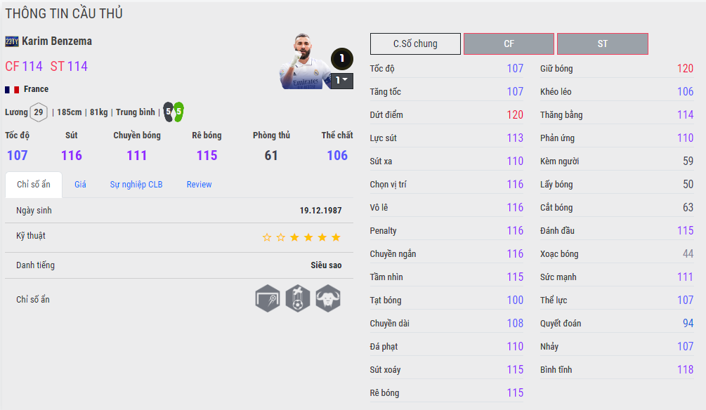 Từ lâu thì Benzema được coi là best CF trong game, tiền đạo này được người ta nhớ nhiều đến vai trò là người đá cặp nhiều hơn là ghi bàn trong Fo4. Benzema chuyền cực hay và thậm chí bạn có thể không cần đến một CAM trong game làm gì cả. Cầu thủ người Pháp có khả năng ghi bàn ở mức tốt ( chưa phải quá xuất sắc ) nhưng những tình huống làm tường hay chọc khe cho đồng đội băng xuống lại vô cùng ảo diệu.