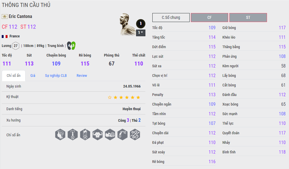 Tiền đạo người Pháp và là huyền thoại của Mu từng một thời làm mưa làm gió trong game khi mới xuất hiện khi mà ông sở hữu tốc độ cũng như thể hình cao lớn. Tuy nhiên sau một thời gian đổi gameplay thì Cantona bị làng quên dần, nguyên do là meta hai chân 5/5 lên ngôi.