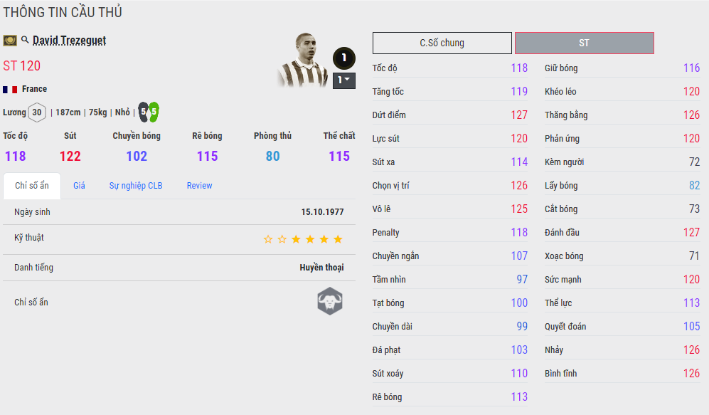 Đây là cái tên sẽ khiến nhiều bạn bất ngờ, nhưng sự thực thì huyền thoại người Pháp là cầu thủ đã có những thay đổi sau khi được nâng cấp chỉ số, đặc biệt là mùa giải ICON TM. Trezeguet có phần hơi khó làm quen nhưng lại là cầu thủ rất toàn diện. Ghi bàn có thể Trezeguet chưa nằm trong top tốt nhất, nhưng quan trọng là cầu thủ này lại có thể làm tường và giúp đồng đội ghi bàn tốt hơn rất nhiều những cái tên khác.