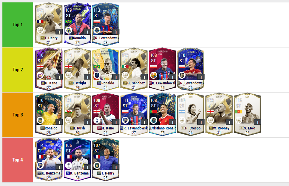 Có rất nhiều cái tên đáng chú ý, nhưng rõ ràng một lần nữa Rô béo mùa rất cũ là MC lại có mặt và đây có thể là tin vui với những ai đang sở hữu tiền đạo này. Ngoài ra thì Lewandowski cũng góp mặt với 2 mùa giải WC22 và 22TY. Harry Kane HG cũng cho thấy anh lợi hại thế nào bất chấp việc ra mắt thêm mùa giải 23TS trong tháng 7 vừa qua.