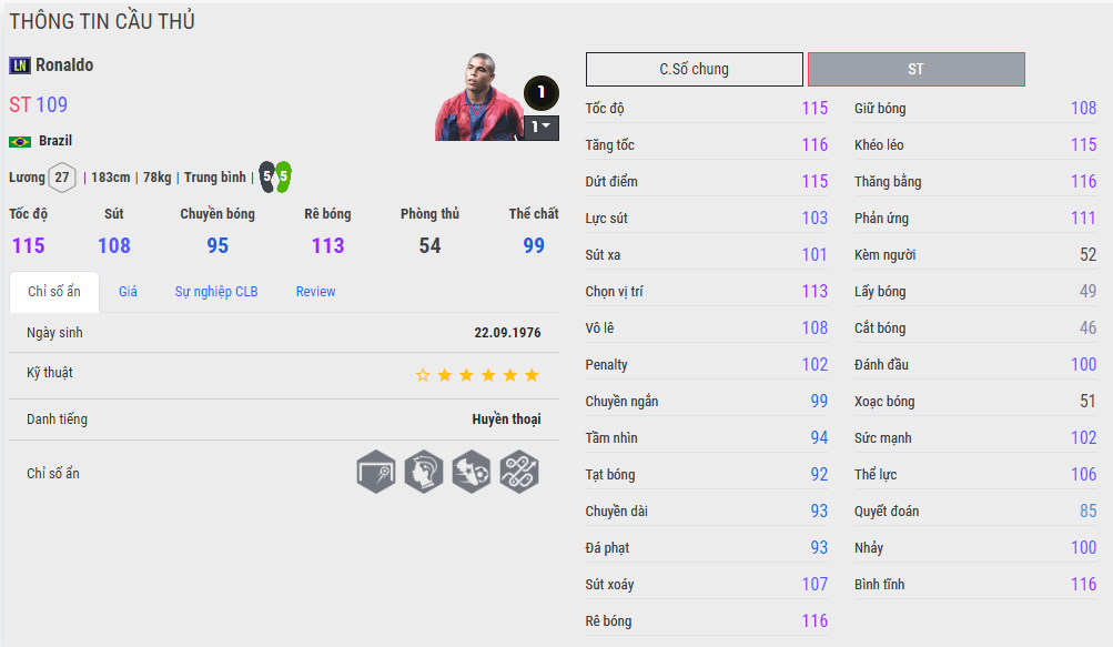 Ronaldo béo mùa LN có thể không được nhiều người đánh giá cao do mùa này Rô béo chuyền khá kém, nhưng bù lại mùa LN lại cho chúng ta một tiền đạo cắm đúng nghĩa, một người có thể chỉ vài khoảnh khắc tỏa sáng cũng có thể biến hàng hậu vệ đối phương thành trò hề. Sở hữu tốc độ cao cùng với độ lắt léo trong rê bóng đây chắc chắn là cầu thủ phù hợp với gameplay 9.3 tính đến 1.9