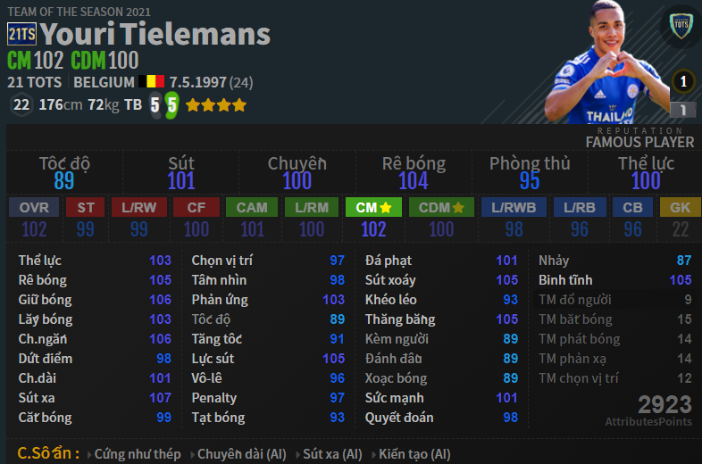 Tiền vệ đang chơi cho Leicester City đã có mùa giải thành công trong màu áo của những chú cáo xanh. Mặc dù không sở hữu một thể hình lý tưởng ở khu vực trung tuyến. Nhưng lại là một máy quét cực tốt ở vị trí giữa sân. Điểm yếu của Tielemans là không chiến trong các pha bóng bổng. Hiện cầu thủ này được khá nhiều người sử dụng bởi sự xông xáo và đặc biệt là 2 chân 5/5
