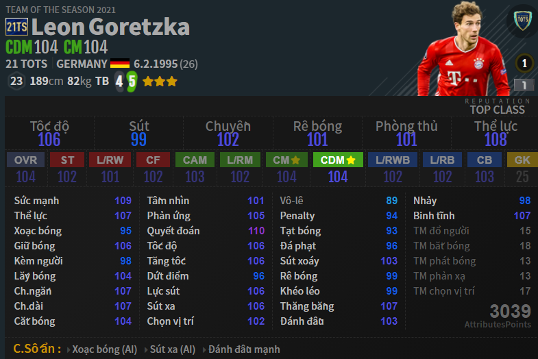 Tiền vệ người Đức quá hoản hảo, và dự đoán sẽ cạnh tranh cực mạnh với Gullit và Ballack. Leon Goretzka có chiều cao, cân nặng và các chỉ số sức mạnh quá khủng. Việc cải thiện gameplay theo đấu tranh vật lý sẽ giúp Goretzka đã mạnh nay càng mạnh hơn.