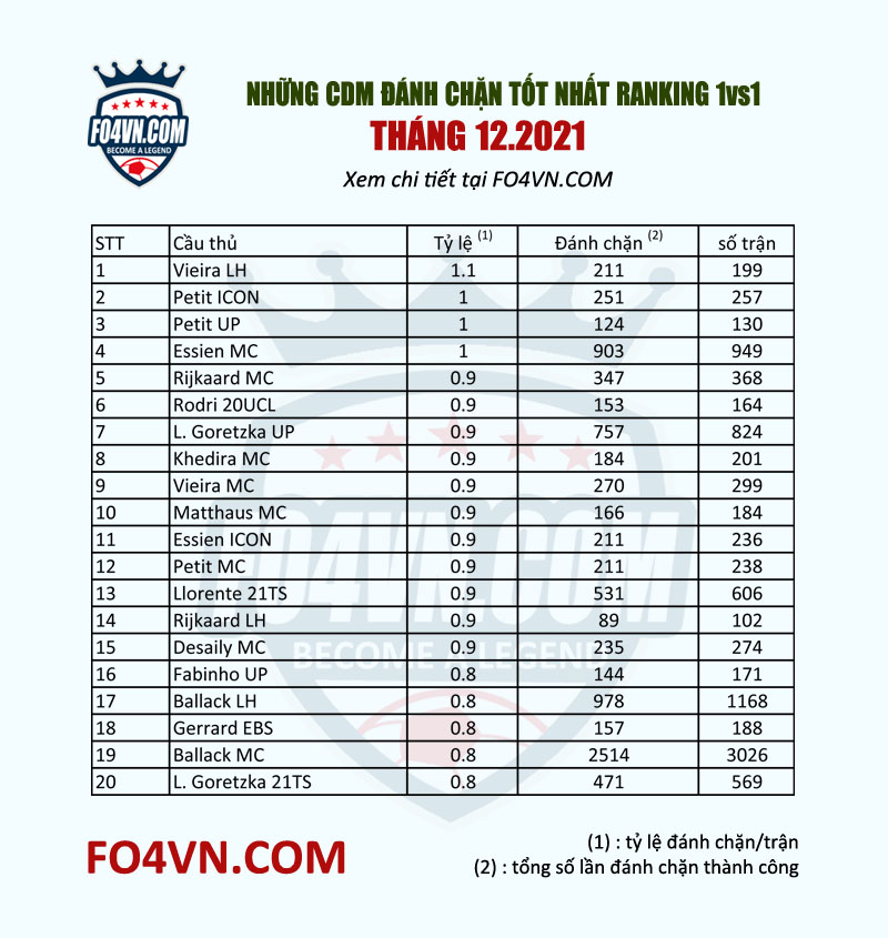 Dưới đây là những cầu thủ đá CDM có tỷ lệ đánh chặn tốt nhất