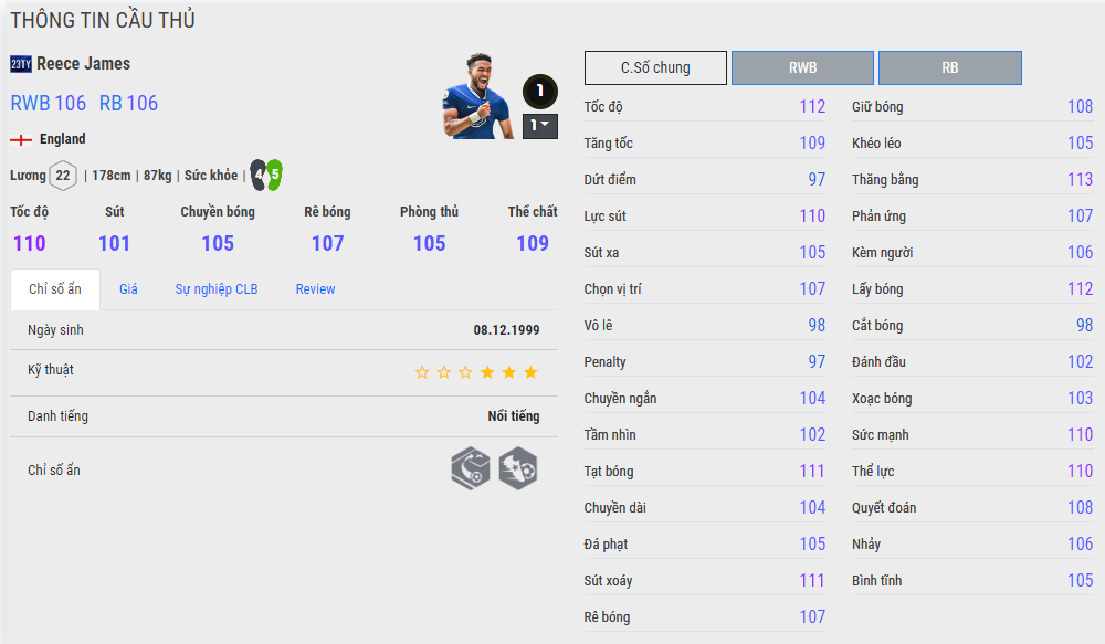 Là một cầu thủ xuất phát ở vị trí RWB, nhưng hiện tại nhiều người lại thích cầu thủ người Anh đá CDM hơn, lý do rất đơn giản đó chính là tốc độ của Reece Jame. Cầu thủ này sở hữu một tốc độ mà bất cứ 3 cái tên kể trên đều phải chào thua, mà meta hiện tại thì cứ nhanh là có thể làm được nhiều điều rồi.
