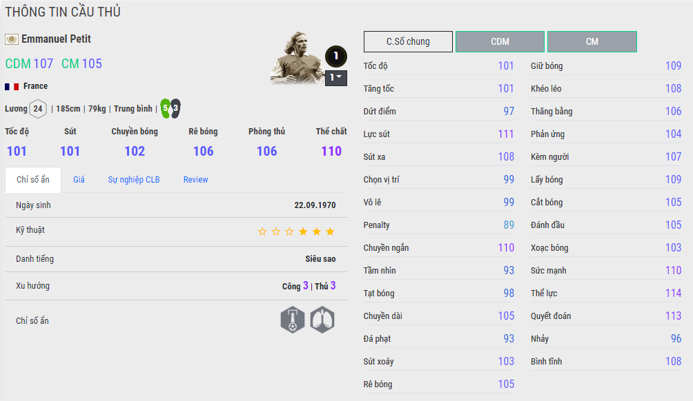 Thêm một cầu thủ mùa ICON có thể chơi tốt ở vị trí CDM cho team Chelsea. Có thể coi Petit là một phiên bản dung hòa giữa cả Essien và Ballack khi anh có thể hình, cân nặng cực cân đối. Tốc độ của Petit cũng ở mức đủ dùng và khả năng va chạm tỳ đè là rất tốt.