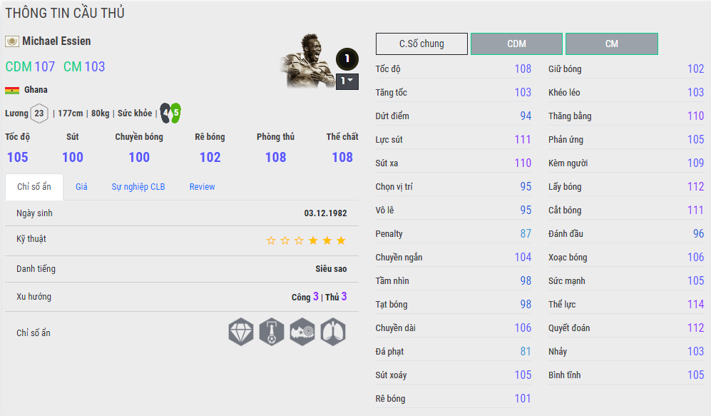 Khỏi phải bàn về độ chất chơi của mùa giải ICON khi Essien luôn làm trong top các CDM đáng được chọn nhất không chỉ của Chelsea mà còn của cả game này. Thể hình vừa đẹp, lối chơi quyết đoán cao cùng với khả năng sút ra khá ổn chính là những điểm mạnh mà mọi người chơi đều thích ở Essien, nói đúng hơn Essien làm người ta quen với kiểu chơi ED hơn. Mức lương của Essien cũng chỉ có 23 và hoàn toàn có thể nâng cấp lên +5 với tình hình phôi hiện tại.