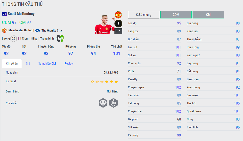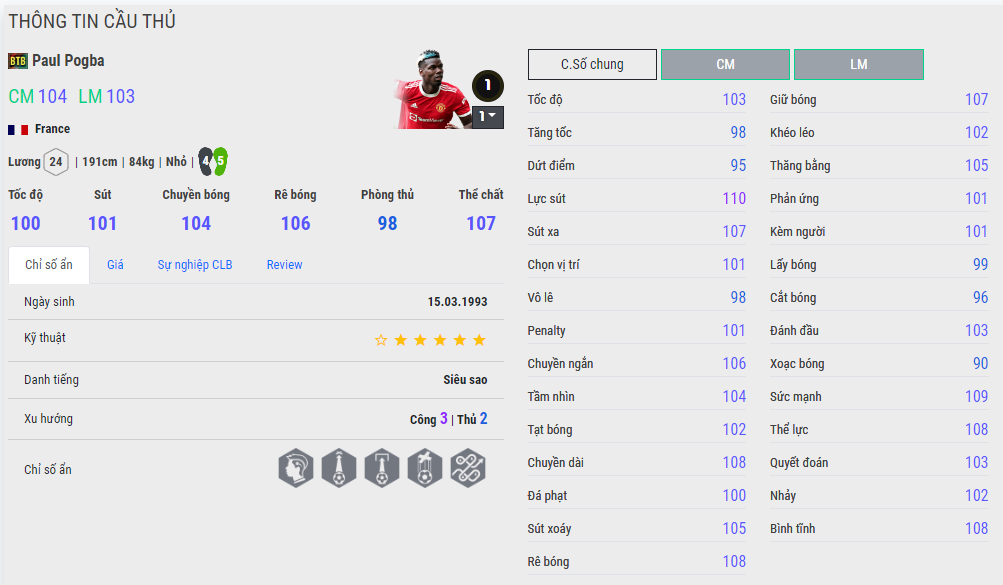 Paul Pogba có một giai đoạn tại Man United không hề dễ chịu khi anh và các đời HLV của CLB luôn có những mâu thuẫn khó giải quyết. Tuy vậy không thể phù nhận là tiền vệ người Pháp có thể đá CDM rất ổn trong game khi có thể hình và kỹ thuật chơi bóng rất phù hợp với meta hiện nay, một cầu thủ biết chuyền bóng.