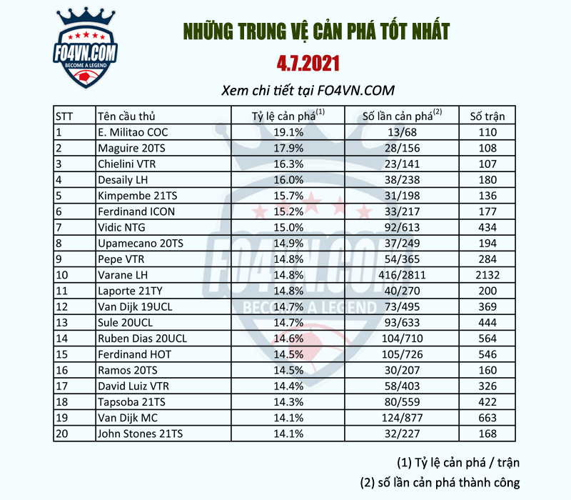 Dưới đây là thống kê các trung vệ đánh chặn tốt nhất hiện tại, tính đến thời điểm viết bài, trong ranking 5000