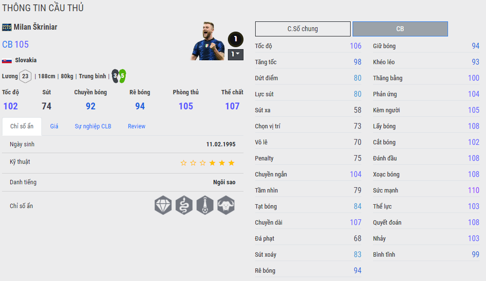 Trung vệ của Inter Milan là mẫu cầu thủ chơi cực đầu óc và chắc chắn, trong những mùa giải mới ra gần đây mà có sự góp mặt của Skriniar trong đó thì anh này luôn là một trong những cái tên quen thuộc được nhiều HLV lựa chọn. 22TS đến giờ vẫn là mùa giải hay nhất của trung vệ người Slovakia
